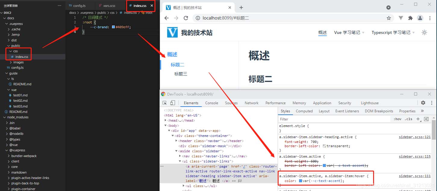 方式二:直接在开发者工具中找到要修改的元素的css名称,然后在 docs/.vuepress/public/css/index.css 中修改即可。如:修改右上角站点名的字体颜色。