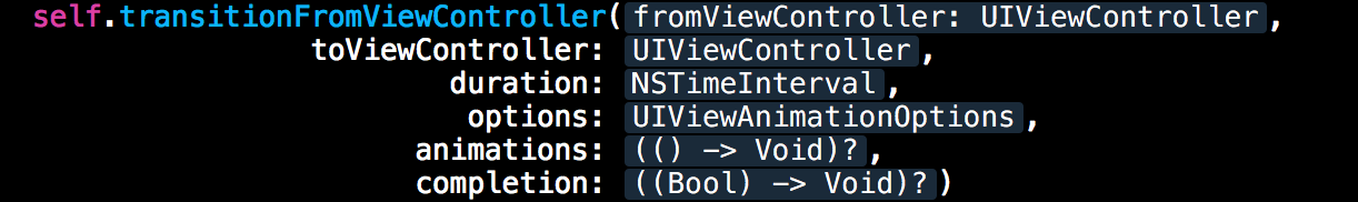 这个方法虽然已经过时,但是对它的分析有助于后面知识的理解。它一共有6个参数,前两个表示从哪个VC开始,跳转到哪个VC,中间两个参数表示动画的时间和选项。最后两个参数表示动画的具体实现细节和回调闭包。