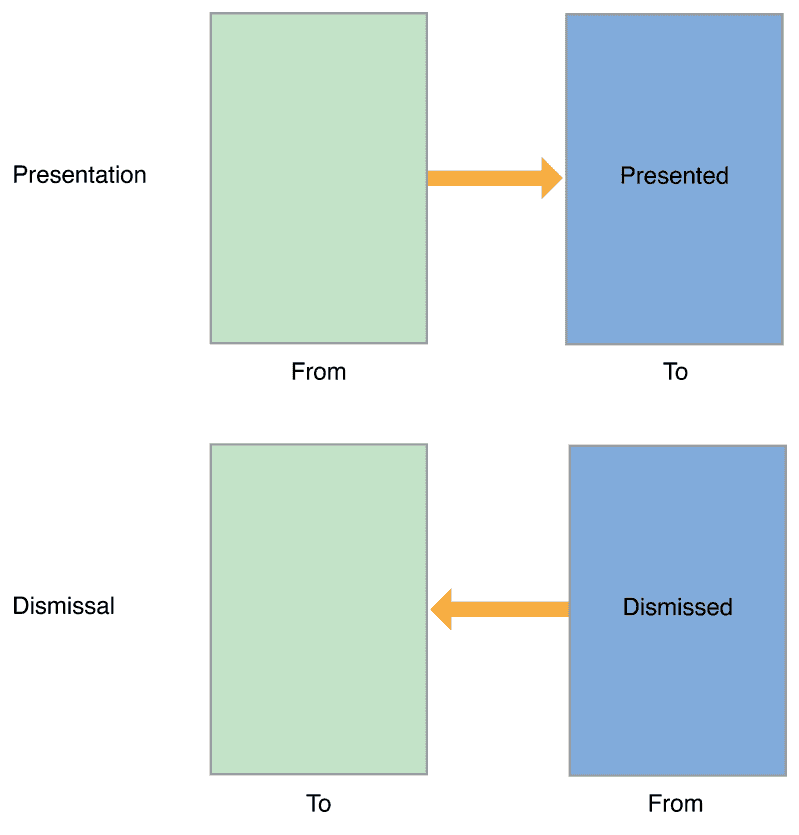 这也是一组相对的概念,它容易与fromView和toView混淆。简单来说,它不受present或dismiss的影响,如果是从A视图控制器present到B,那么A总是presentedViewController,B总是presentingViewController。