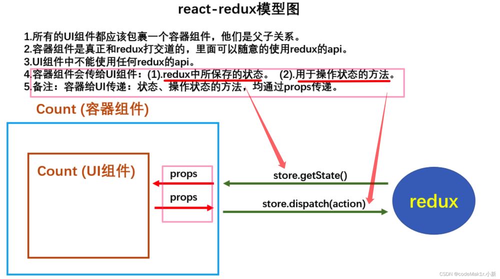 备注:容器组件中的store是靠props传入的,而不是在容器组件中直接引入。