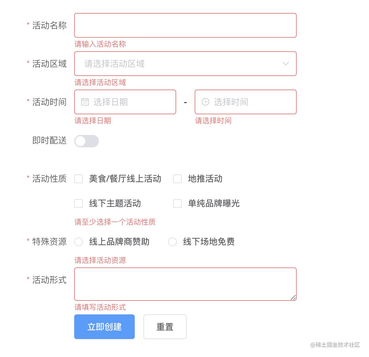 一般来说,element-ui的表单是提供表单校验的,就是写好只有,点击提交如果不通过会有红字提醒,如下图: