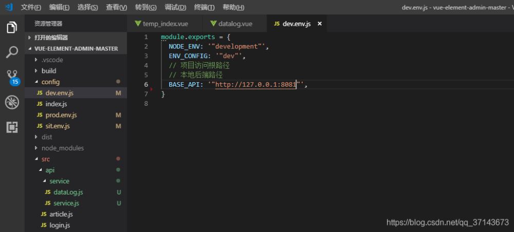 这个文件夹里的 BASE_API 后台接口的就是公共路径,调后台的时候要记得改,这是本地的,剩下的 prod 和 sit 分别是正式环境打包和 测试环境打包的