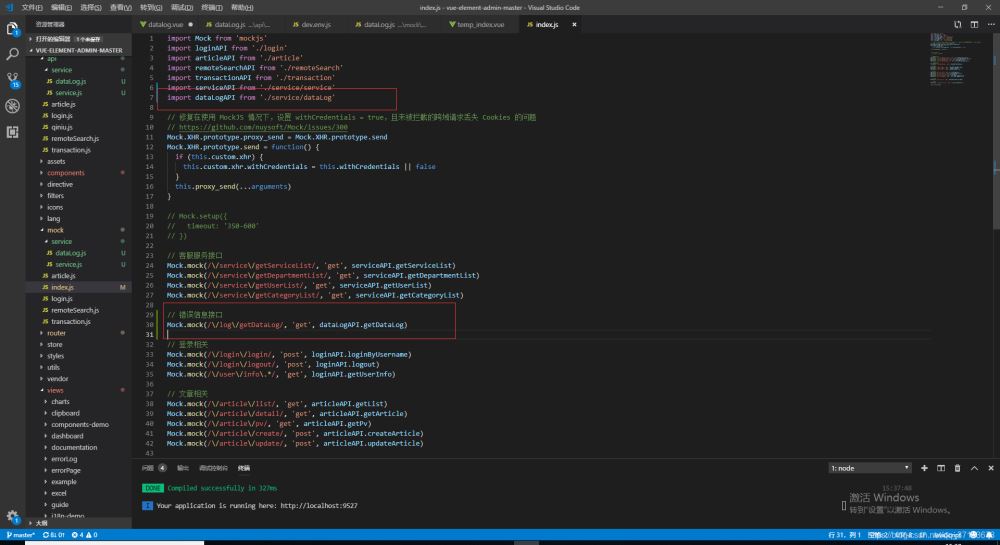 }这里访问路径就是 http://127.0.0.1:8081/log/getDataLog,如果全路径访问也是可以的,url 前面带了 “/”意思就是会进行路径的拼接,如果写的是 url: 'log/getDataLog' 那么访问就报错了,因为前缀没拼上,还有要把 mock 里的 index.js 文件里的注掉,要不会拦截变成假数据