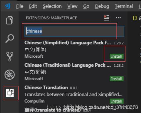 选择左侧左下方的扩展按钮,搜索chinese 安装下图的插件