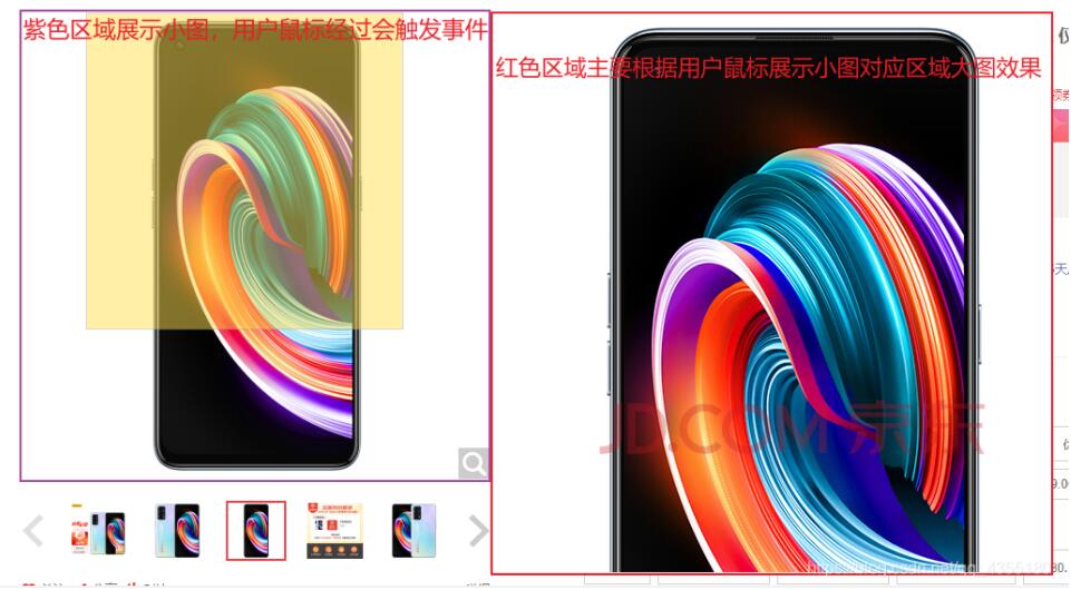 本文分享一个电商平台常见查看商品细节图案例,如某东网站手机类别中具体某一部手机详情页中,手机的细节图展示,左侧小图获得用户鼠标焦点即可在屏幕右侧展示出该图片区域的大图效果,其中JS部分主要涉及鼠标经过、鼠标离开、鼠标移动等事件以及含有一个小算法公式,先展示效果: