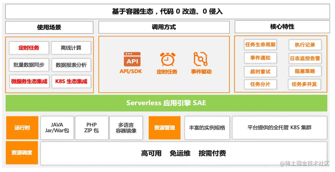 SAE (Serverless 应用引擎)Job 解决了上述定时任务解决方案的各种痛点,用户无需关注任务的调度和集群资源,无需部署的额外的运维依赖组件,也无需自建一整套监控告警系统,同时更重要的是无需云主机 7*24h 常驻,在低资源利用率的环境下持续消耗闲置资源。