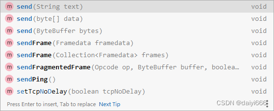 通过WebSocketClient 类的实例,我们可以看到有以下方法,很明显send方法就是用来发送消息使用的
