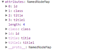 可以发现有一个名为“attributes”的属性,类型是NamedNodeMap,同时有“id”和“className”、”title“等基本的属性,但没有“titles”这个自定义的属性。