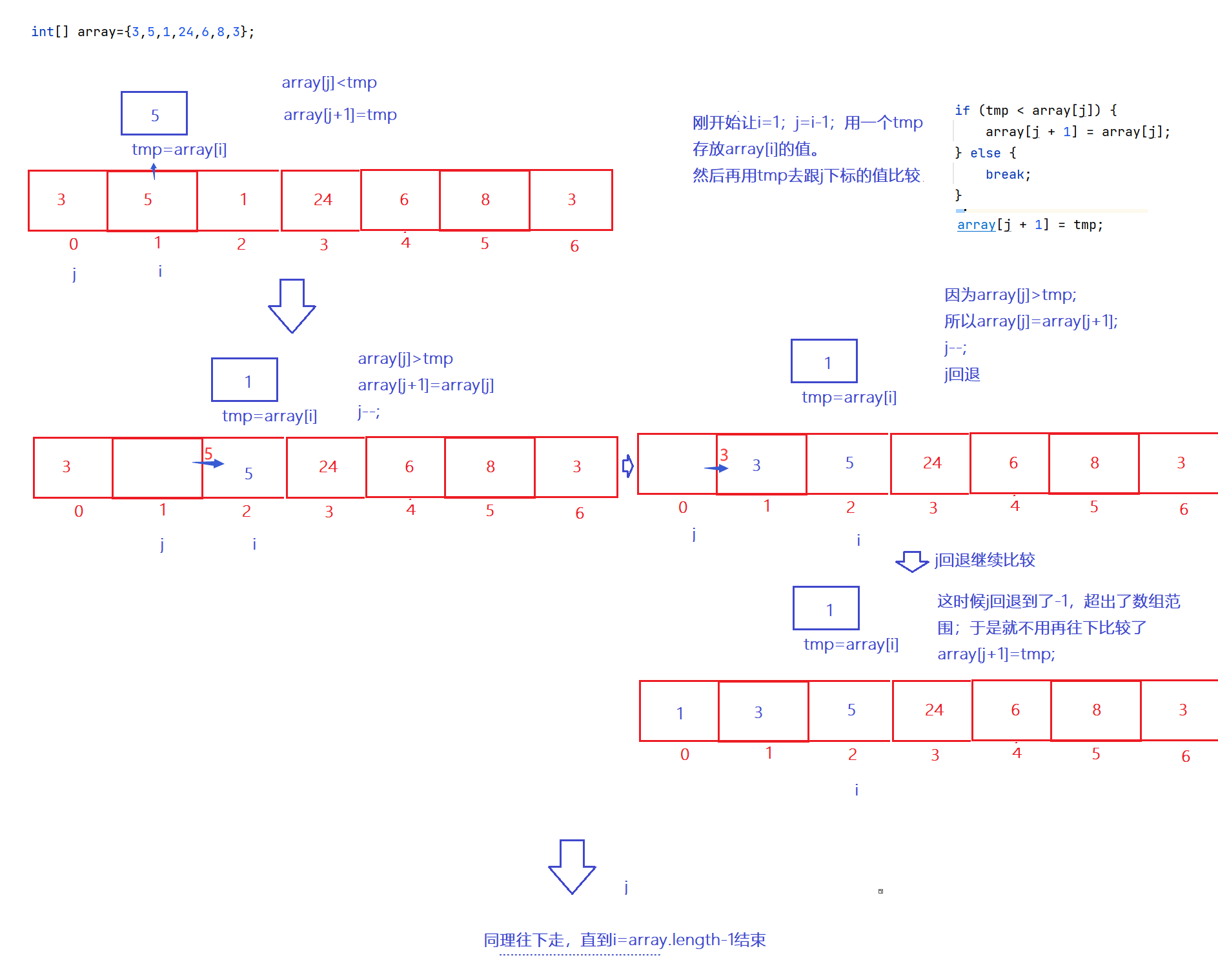 从数组下标为1开始,将下标为1上的值取出来放在tmp中,然后它和前面的下标j上的值进行比较,如果前面下标j上的值比它大,则前面下标j上的值往后走一步,直到比到j回退到了-1或者j下标上的值比tmp小为止,然后把tmp插入到下标为[j 1]的位置上。然后i就继续往后走,继续比较,直到i走到数组的最后。