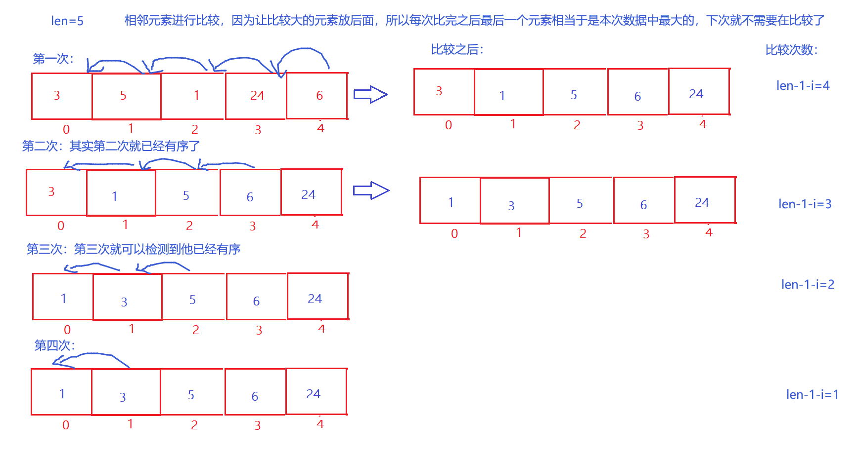 在无序区间,通过相邻数的比较,将最大的数冒泡到无序区间的最后,持续这个过程,直到数组整体有序。