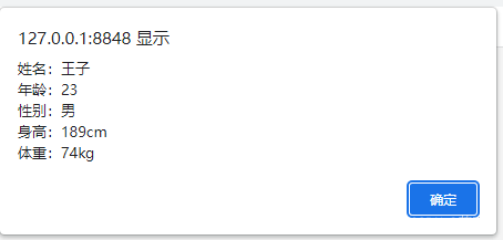alert("姓名:" name "\n年龄:" age "\n性别:" sex "\n身高:" height "\n体重:" weight);