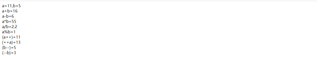 例子1:声明两个变量(a,b),再通过算术运算符对两个变量进行不同的运算,输出结果