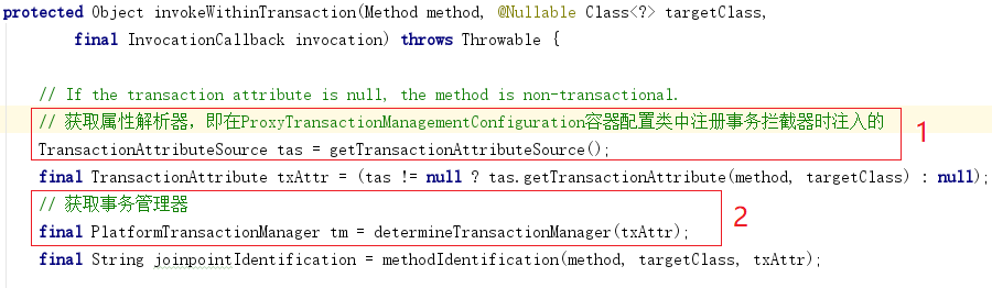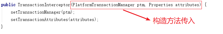 - 构造方法传⼊PlatformTransactionManager(事务管理器)、TransactionAttributeSource(属性解析器),但是追溯一下上⾯贴的ProxyTransactionManagementConfiguration的源码,在注册事务拦截器的时候并没有调用这个带参构造方法,而是调用的无参构造方法,然后再调用set方法注⼊这两个属性,效果⼀样。