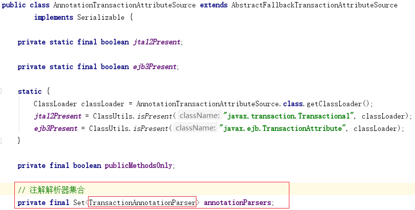 属性解析器有⼀个成员变量是annotationParsers,是⼀个集合,可以添加多种注解解析器(TransactionAnnotationParser),我们关注 Spring 的注解解析器,部分源码如下
