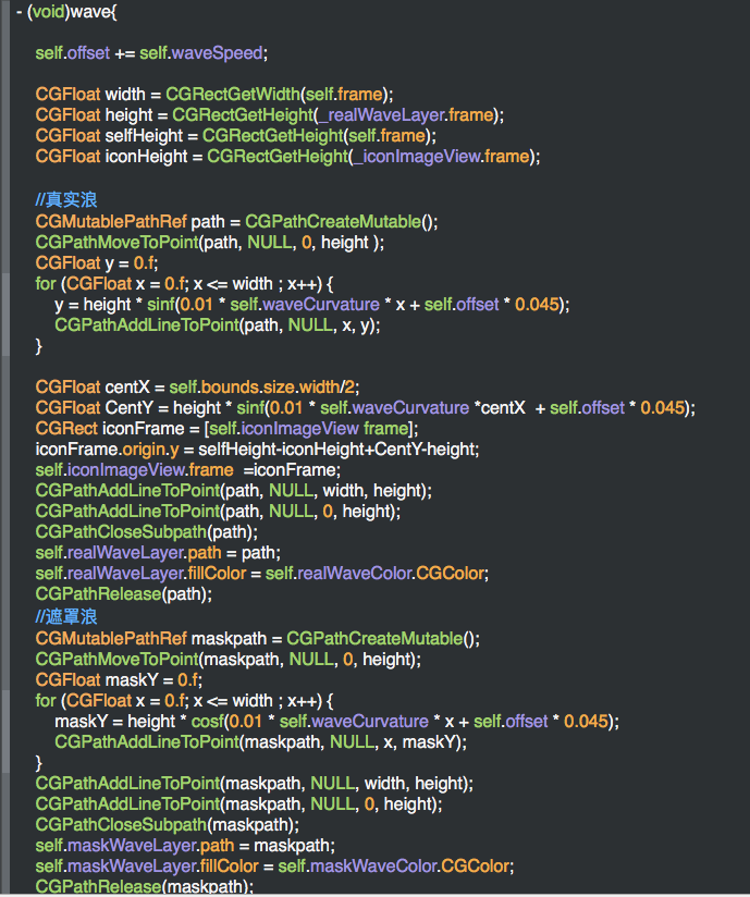 CAShapeLayer *Layer = [CAShapeLayer layer]; Layer.frame = self.bounds; Layer.fillColor = self.realWaveColor.CGColor; Layer...等属性 [self.view.layer addSublayer:Layer];