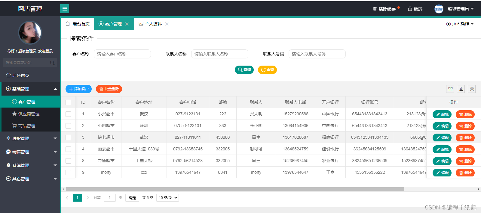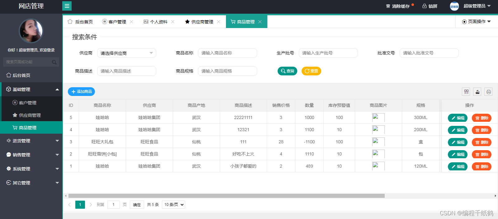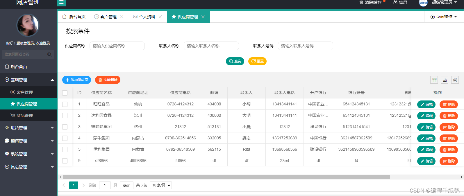 基础管理模块:包含客户管理、供应商管理、商品管理三个子模块