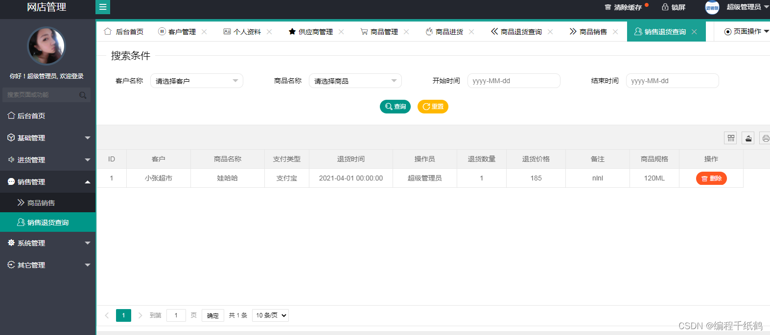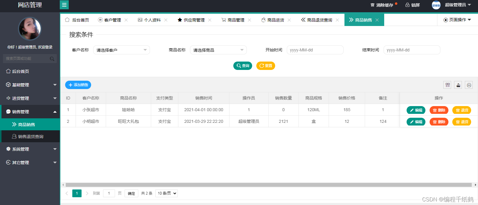销售管理:包含商品销售、退货、销售退货查询几个子查块
