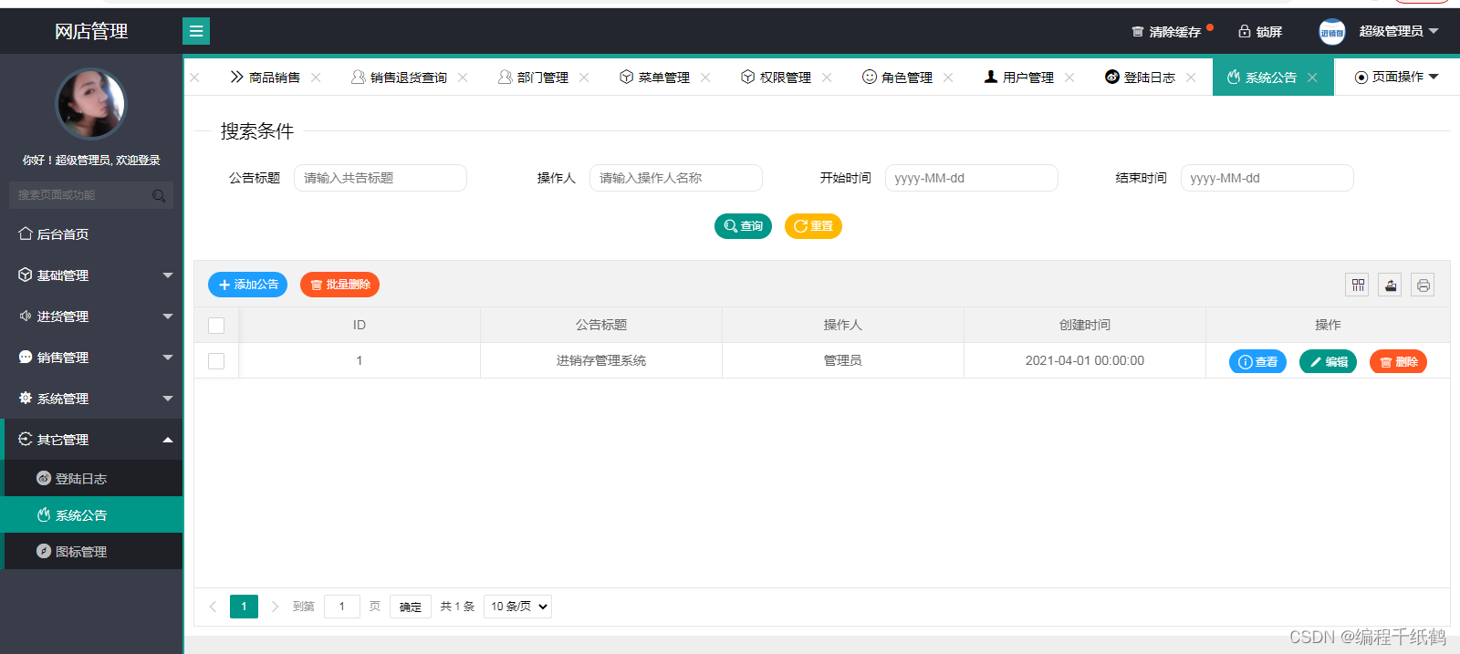 其它管理:包含登陆日志查询、系统公告管理、图标管理等几个子模块