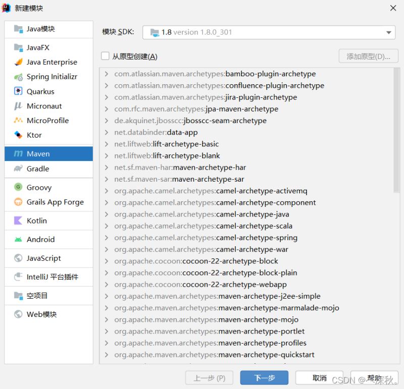 选中Maven模块,保持默认,点击下一步: