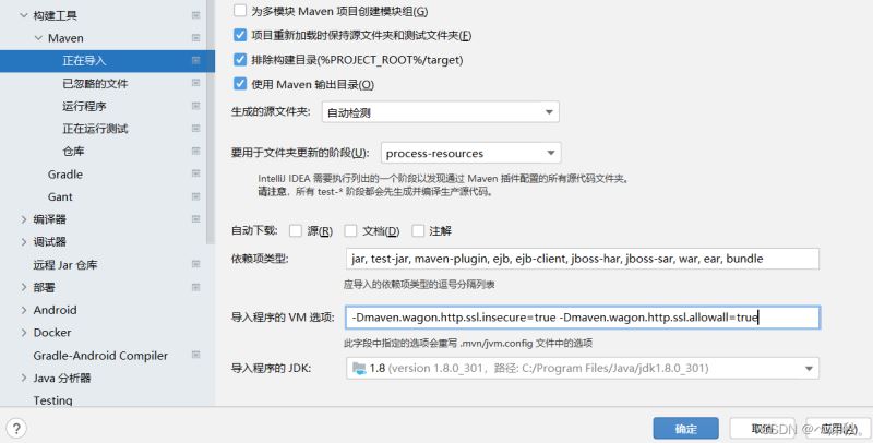 注:这里设置的忽略SSL证书验证,防止连不到阿里云的服务器无法自动下载依赖,而出现找不到依赖的错误 。