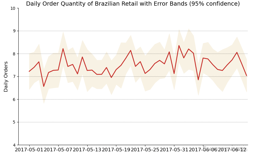 plt.title("Daily Order Quantity of Brazilian Retail with Error Bands (95% confidence)",fontsize=14)