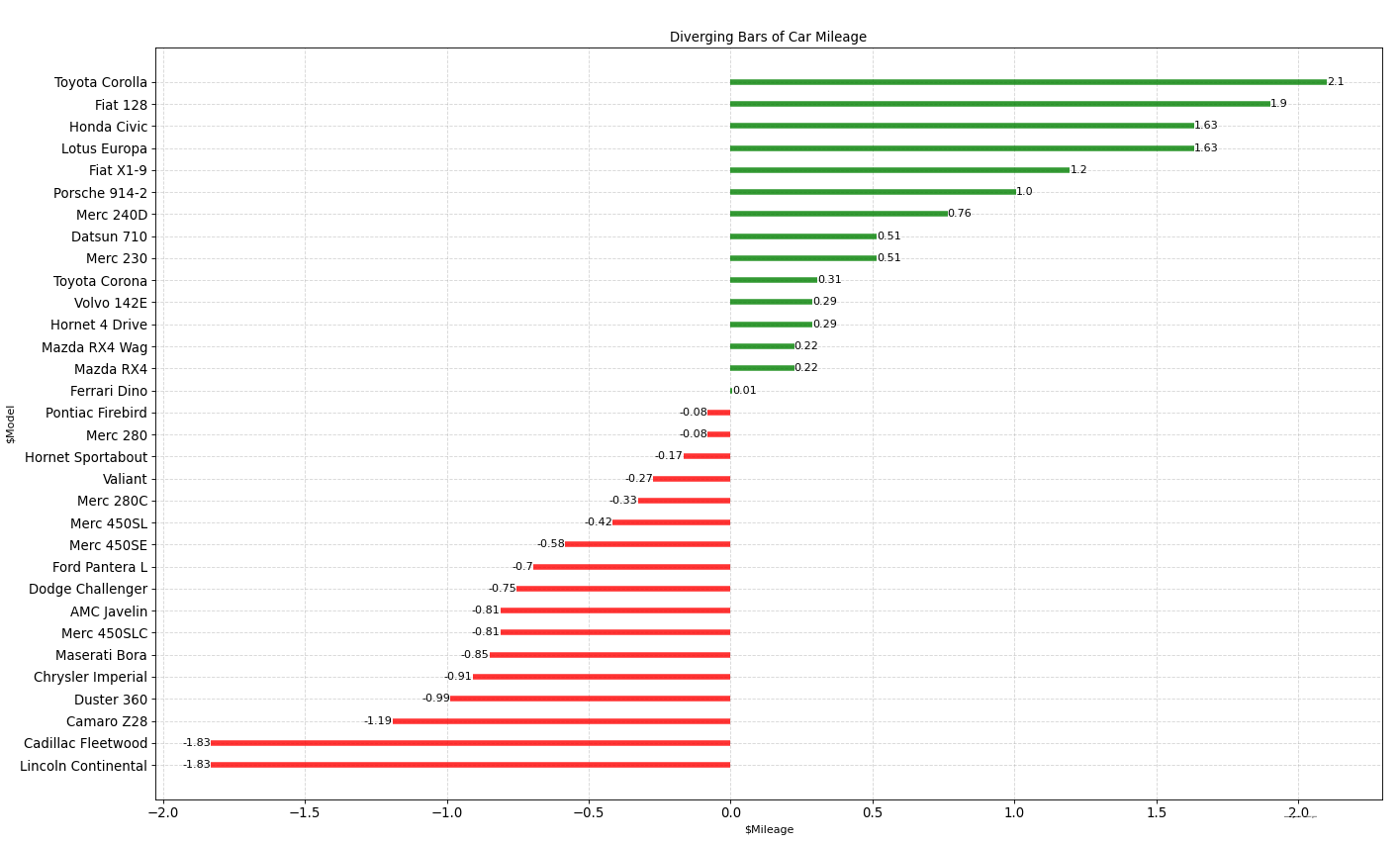 df['colors'] = ['red' if x < 0 else 'green' for x in df['mpg_z']]