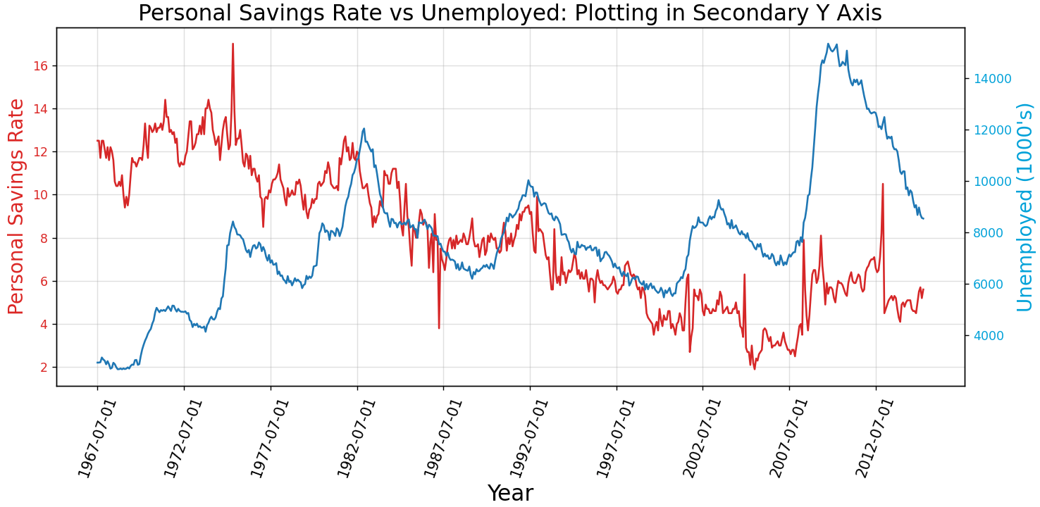 "Personal Savings Rate vs Unemployed: Plotting in Secondary Y Axis",