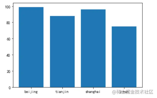 import matplotlib.pyplot as plt x = ["beijing", "tianjin", "shanghai", "jinan"] y = [99, 88, 96, 75] plt.bar(x,y) plt.show()