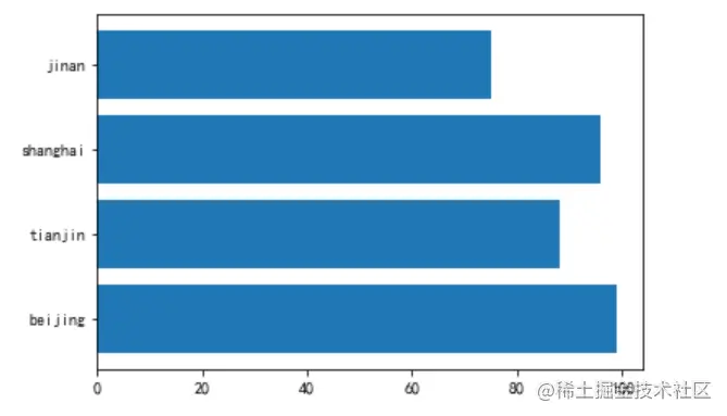 import matplotlib.pyplot as plt x = ["beijing", "tianjin", "shanghai", "jinan"] y = [99, 88, 96, 75] plt.barh(x,y) plt.show()
