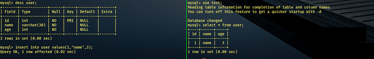 CREATE DATABASE test; USE test; CREATE TABLE user( id BIGINT PRIMARY KEY, name VARCHAR(30) NOT NULL, );