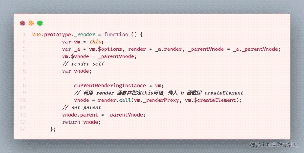 可以看到_render就是调用render函数并返回 vnode。不过在第10行可以发现,调用render函数的方式并不是直接调用,而是通过call方法,第一个参数是 render函数的this环境,第二个参数就是在render函数中的参数h。