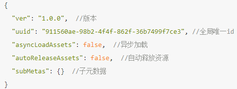 预制件的 meta 文件与场景是一样的。png 图片的 meta 文件信息比较多,除了基本的 ver 和 uuid 外,还记录了图片的宽高、偏移、九宫格等数据。上面这么多信息,我们这里只关心一个:uuid。uuid : 通用唯一标识符(Universally Unique Identifier) uuid 是 Creator 用来管理游戏资源的。它会为每个文件分配一个唯一的 id,图集会生成多个。由此可以了解在 Creator 引擎中,识别一个文件不是简单地通过 路径 文件名 定位,而是通过 uuid 来引用文件。因此可以在编辑器资源管理中,随意删除、移动文件。