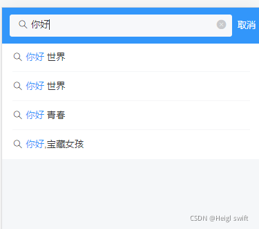 做搜索功能是有搜索建议模块,该模块需要对等于输入搜索框字符串的字符串进行高亮显示,效果图如图所示: