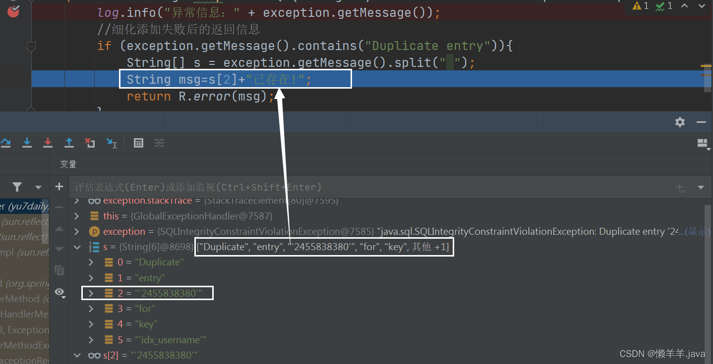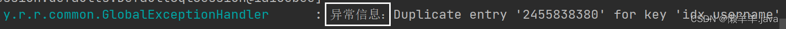 public R<String> excpHandler(SQLIntegrityConstraintViolationException exception) {//捕获到的异常被传到方法的形参里