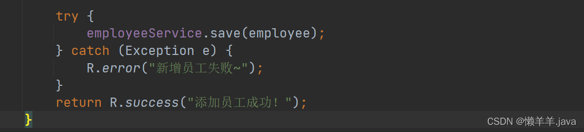 总而言之,方法里涵盖了表单里提交的数据和请求发生后动态变更的数据,而我们写好了save()方法之后,就得去用Service层(employeeService)来执行这个方法将数据保存到数据库中,就像这样:
