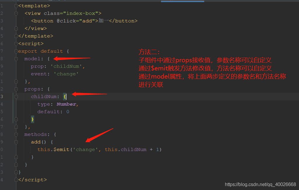 子组件props接收参数,参数名称可以自定义,$emit触发方法传值,方法名称可以 自定义,通过model属性将prop参数名和事件名进行关联