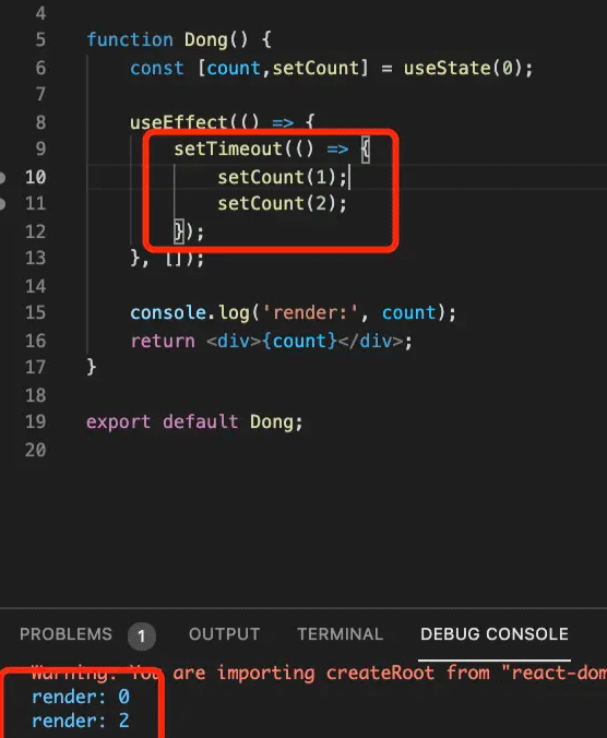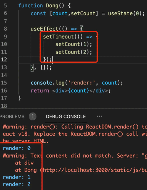 在 setTimeout 里修改了两次 state,并打印了 state 的值。如果是异步的,那应该打印的时候 count 还没修改,依然是 0,所以打印两次 0。然后初始化渲染一次,setState 后再渲染一次,应该 render 两次,count 分别为 0 和 2。按照异步的方式来分析,确实应该是这样的。