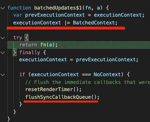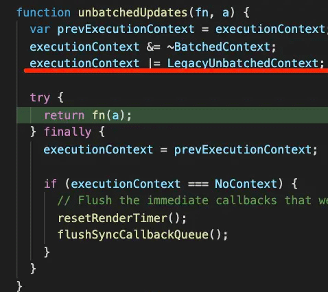 其实在 ReactDOM.render 执行的时候会先调用 unbatchUpdates 函数: