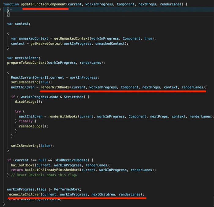 从 vdom 转换成 fiber 的过程就叫做 reconcile,转换过程中会顺便创建对应的 dom 元素,然后全部转换完后一次性 commit 到 dom。这个过程不是一次性的,是通过 scheduler 调度执行的,那也就可以分批次进行,也就是可打断的含义。这就是 React 的 fiber 架构下的渲染流程。理论说完了,我们来对应到源码看一下(这里看的是 v17 的源码):