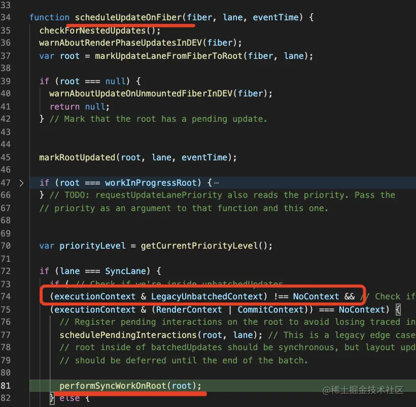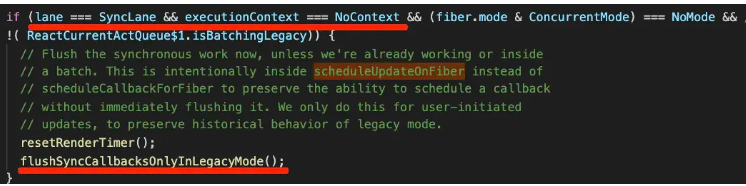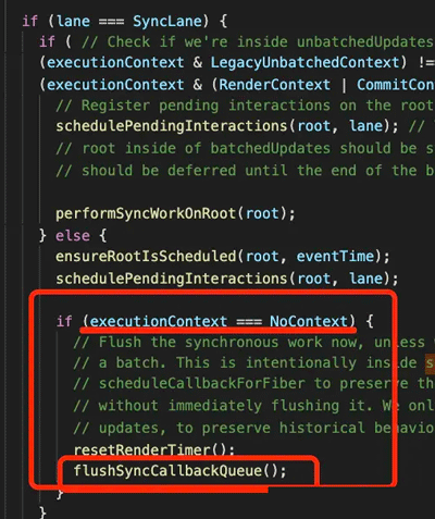 而且为了兼容 react17 这种情况,还做了特殊处理,当没有开启并发模式,也就是还是用 ReactDOM.render 的 api 时,没有指定 excutionContext 还会立刻渲染: