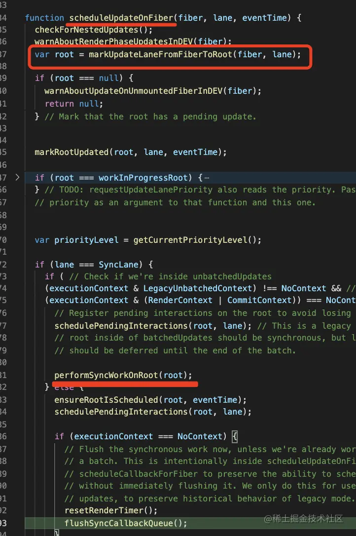 调度更新自然就是调度上面说的那个 performSyncWorkOnRoot 函数:react 会先从触发 update 的 fiber 往上找到根 fiber 节点,然后再调用 performSyncWorkOnRoot 的函数进行渲染:
