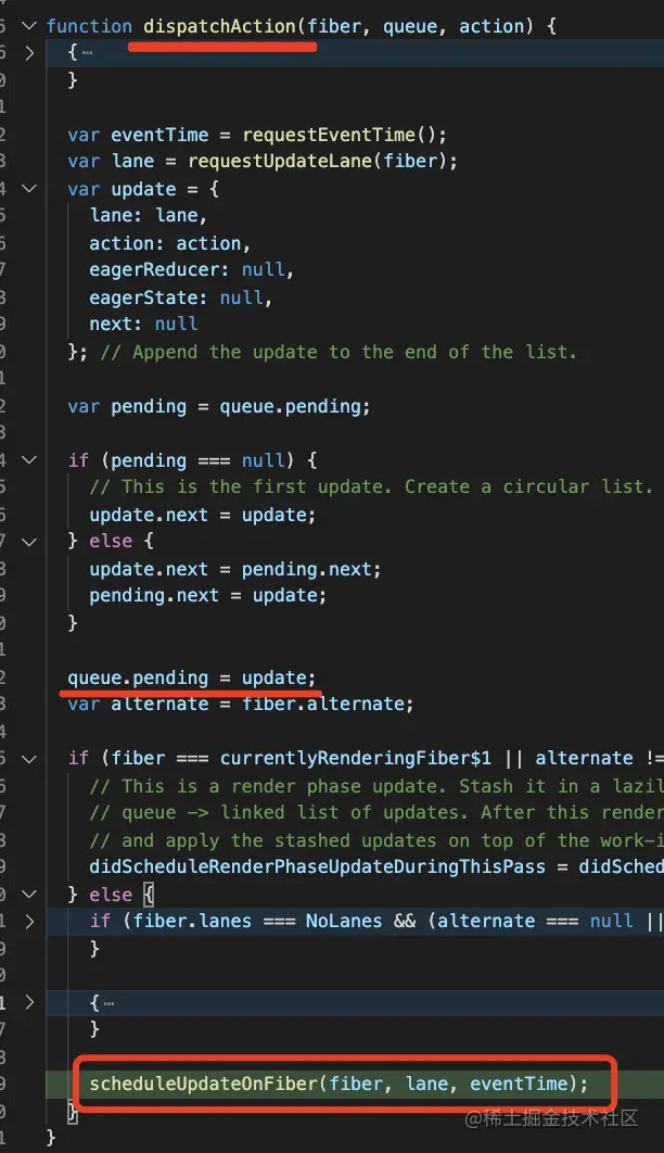 确实是这样的。setState 会调用 dispathAction,创建一个 update 对象放到 fiber 节点的 updateQueue 上,然后调度渲染: