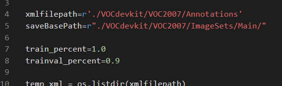 然后修改voc2ssd.py里面的trainval_percent,一般用数据集的10%或者更少用于测试。如果大家放进VOCdevikit的数据集不是全部数据,而是已经筛选好的测试数据集的话,那么就把trainval_percent设置成0,表示全部的数据都用于测试。
