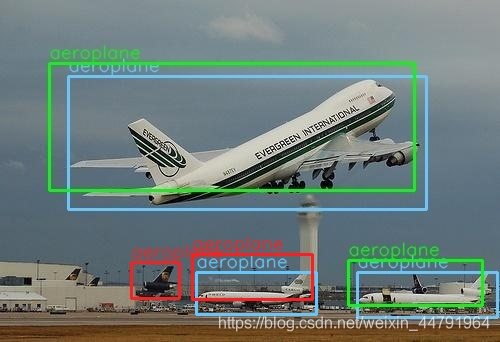 如图所示,蓝色的框是 真实框。绿色和红色的框是 预测框,绿色的框是正样本,红色的框是负样本。一般来讲,当预测框和真实框IOU>=0.5时,被认为是正样本。
