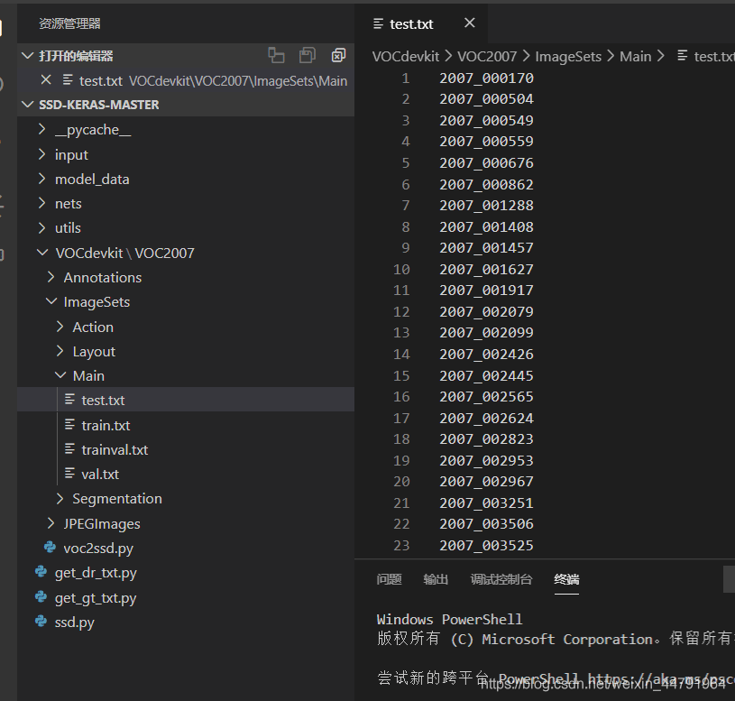然后运行voc2ssd.py。此时会生成test.txt,存放用于测试的图片的名字。