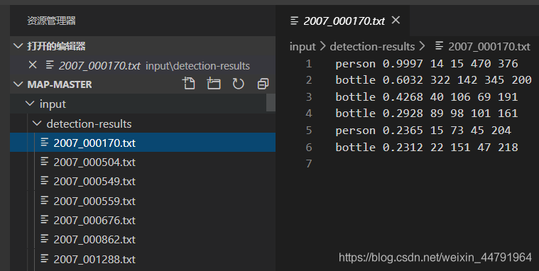 然后依次运行主目录下的get_dr_txt.py和get_gt_txt.py获得预测框对应的txt和真实框对应的txt。get_dr_txt.py是用来检测测试集里面的图片的,然后会生成每一个图片的检测结果,我重写了detect_image代码,用于生成预测框的txt。利用for循环检测所有的图片。