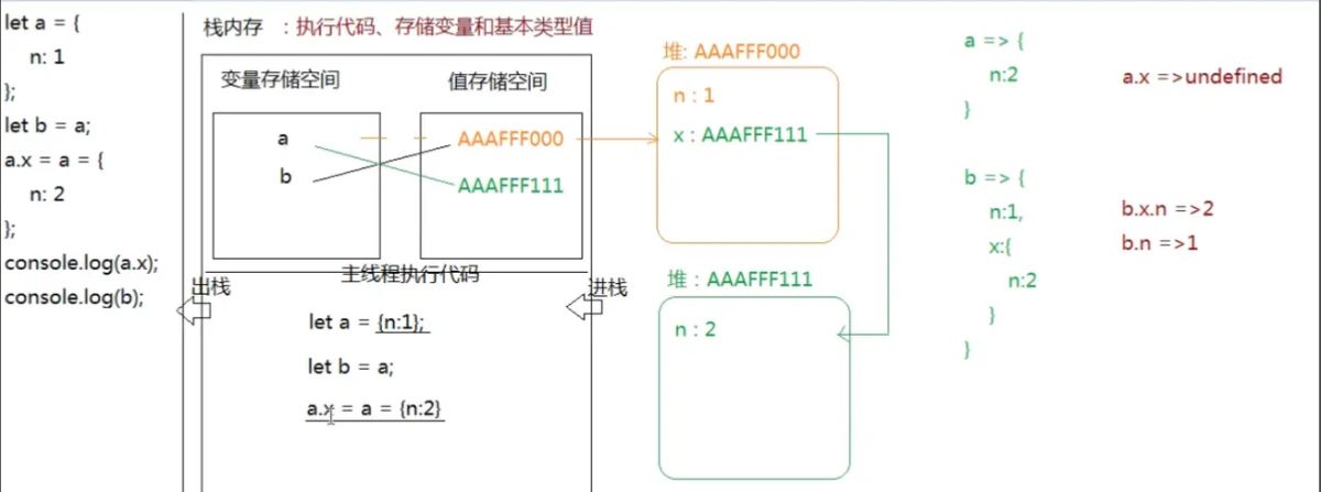 var a = {n:12};创建一个堆内存,把键值对存储到内存中,堆内存地址放到栈中,共变量调用