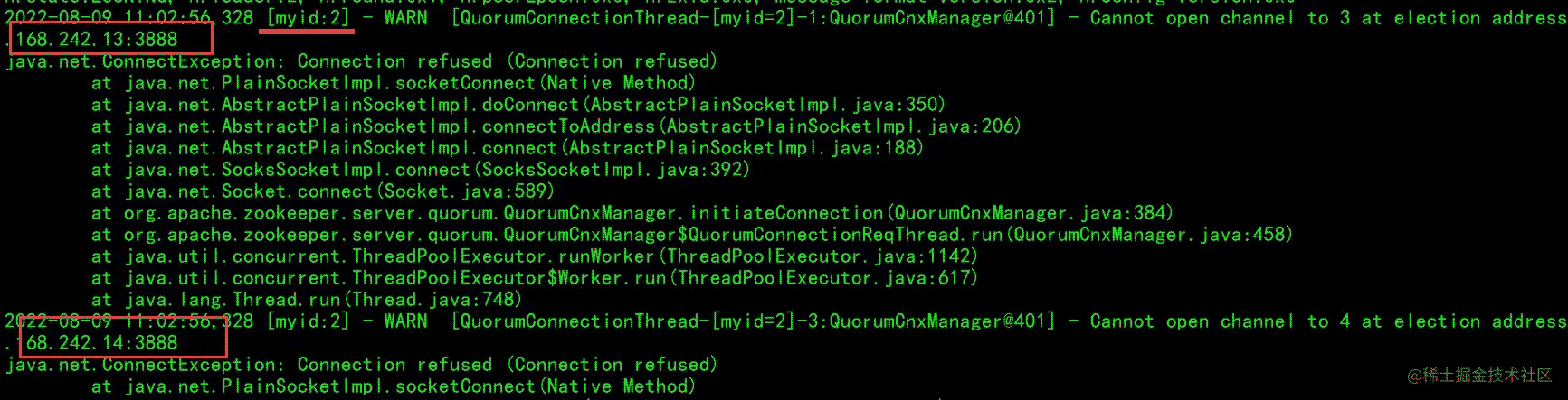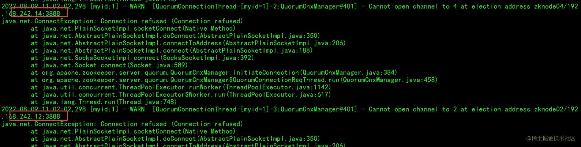 会报错,因为 zoo.cfg 配置了4台主机,其余三台还未启动,接着启动 zknode02 的: