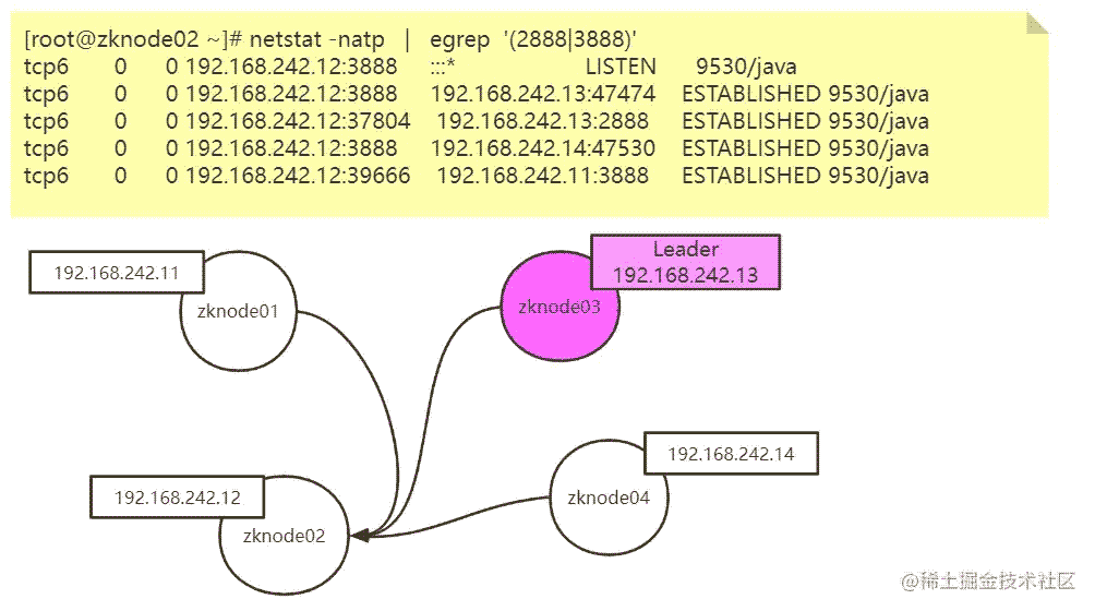 [root@zknode02 ~]# netstat -natp | egrep '(2888|3888)' tcp6 0 0 192.168.242.12:3888 :::* LISTEN 9530/java tcp6 0 0 192.168.242.12:3888 192.168.242.13:47474 ESTABLISHED 9530/java tcp6 0 0 192.168.242.12:37804 192.168.242.13:2888 ESTABLISHED 9530/java tcp6 0 0 192.168.242.12:3888 192.168.242.14:47530 ESTABLISHED 9530/java tcp6 0 0 192.168.242.12:39666 192.168.242.11:3888 ESTABLISHED 9530/java