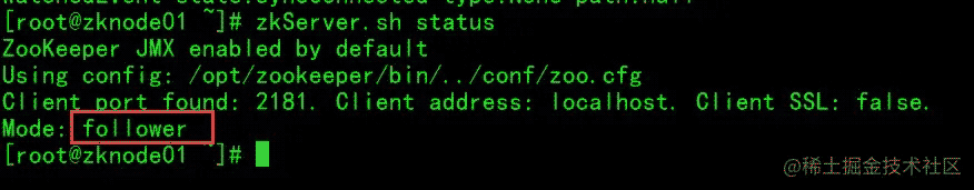^C[root@zknode03 conf]# zkServer.sh status ZooKeeper JMX enabled by default Using config: /opt/zookeeper/bin/../conf/zoo.cfg Client port found: 2181. Client address: localhost. Client SSL: false. Error contacting service. It is probably not running. [root@zknode03 conf]# [root@localhost ~]#
